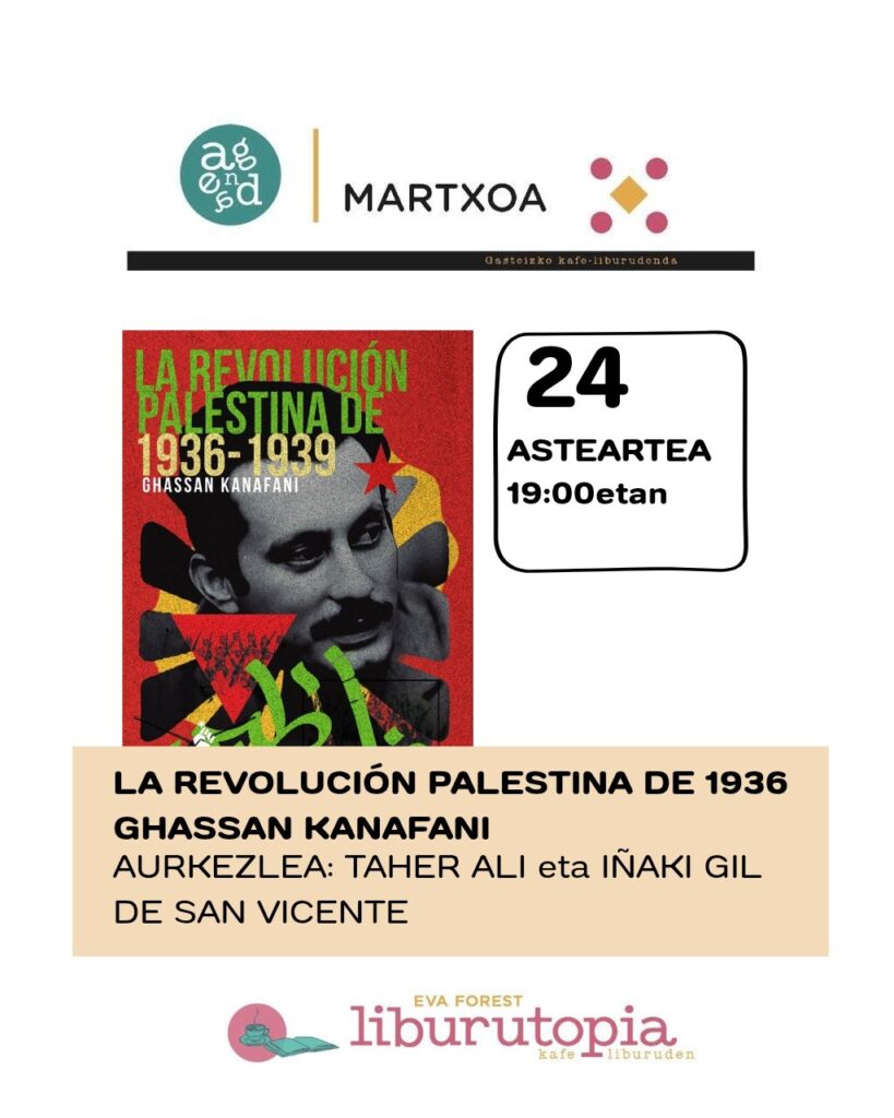 A las 19:00 del próximo martes 24 de marzo va a tener lugar en Eva Forest Liburutopia, Gasteiz, la presentación del libro La revolución palestina de 1936 – 1939, de Ghassan Kanafani, editado por Boltxe Liburuak y traducido del inglés por Beatriz Morales Bastos. Ahora mismo, Asia Occidental sufre la brutalidad asesina del imperialismo, pero también otros pueblos la padecen aparentemente más «suavizada» como la reciente invasión de Venezuela por Estados Unidos para secuestrar al presidente Nicolás Maduro y su esposa Cilia Flores, democráticamente elegidos, o la guerra múltiple contra Cuba, o la descarada preparación de un ataque imperialista contra los pueblos del Sahel y de África y contra China Popular, sin hablar de la permanente agresión de la OTAN contra la Federación Rusa, por citar algunos casos. El libro que se va a presentar en