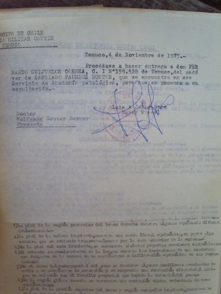 En cuanto a archivos legales existentes entre la documentación, se puede concluir que la muerte de Santiago Faúndez fue planificada desde mucho antes de su ejecución e incluso su detención. Digo esto porque desde la fecha del 4 de noviembre de 1973, se dispuso la entrega póstuma del cadáver a Fernando Guijuelos Correa, quien entregara el dato a la madre de Santiago cuando el cadáver de este último se encontraba en la Morgue del Servicio Médico Legal de Temuco.