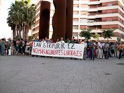 •Ayer a la tarde 150 personas se concentraron en la Plaza Bide Onera de Barakaldo para denunciar las muertes en el lugar de trabajo y la precariedad laboral. Pero esta lacra sigue, hoy se ha conocido el fallecimiento de un trabajador en un «accidente» laboral. En lo que llevamos de 2010 han sucedido al menos 42 personas en «accidentes» laborales en el conjunto de Euskal Herria, de ellos 9 en Araba, 14 en Bizkaia, 8 en Gipuzkoa, 7 en Nafarroa y 3 en Iparralde.