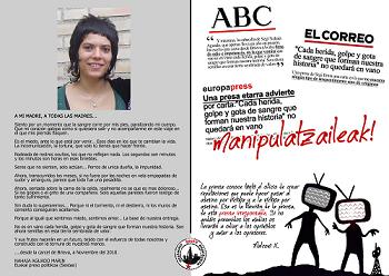 Sin ningun tipo de rubor ni de verguenza, la brunete mediatica, capitaneada por ABC, El Correo y la agencia de noticias Europa Press, han manipulado y reinterpretado el contenido de una carta que Nahia, presa vasca sestaotarra habia escrito para su ama y de paso para todas las amas de Euskal Herria. Para estos medios, estamos ante amenazas de la presa. Y segun estos periodistas, por llamarles de alguna manera, se trata de un texto cargado de odio y revanchismo.