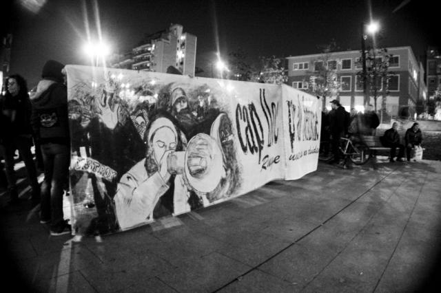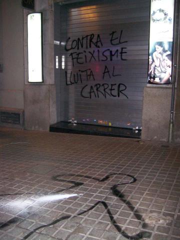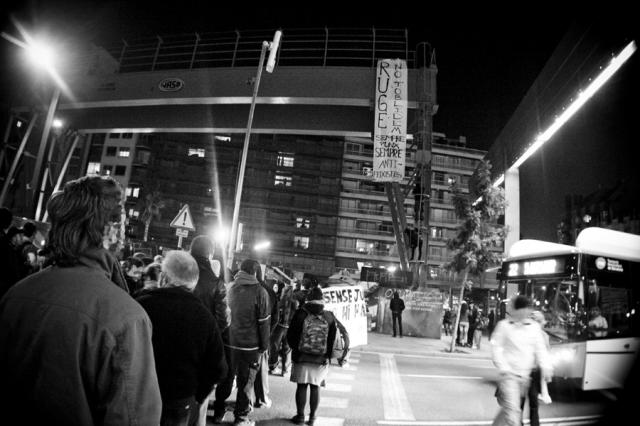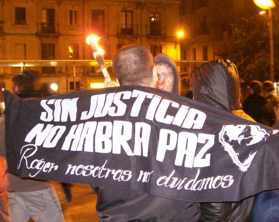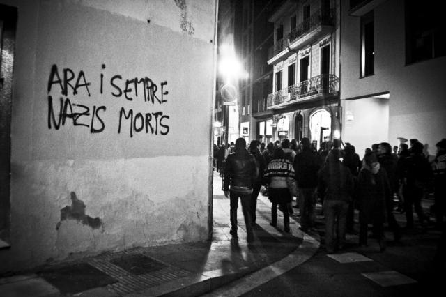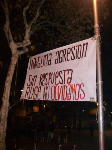 La manifestación comenzó sobre las 20:15 en la plaza Lesseps, frente a la biblioteca, y bajó por Torrent de l’Olla. Unas siete furgonas de antidisturbios la seguían. Nada más cortar la primera calle dos solidarixs se subieron a una maquinaria de obra que había en la plaza y desplegaron una pancarta en recuerdo a Roger, asesinado por unos neonazis en las fiestas de Gràcia de hace 6 años. Durante todo el recorrido apenas se dejaron ver los Mossos d´Esquadra cerca de los manifestantes, ya que la mayoría iba de paisano. En la parte baja de Gracia, concretamente en la calle de la Librería Europa ‑cuyo propietario, Pedro Varela, en poco tiempo ingresará en prisión‑, varias furgonetas protegían el local de posible ataques.