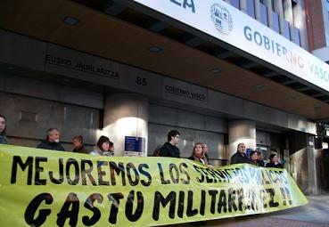 Representantes de los sindicatos ELA, CCOO, LAB, ESK, STEE-EILAS, CGT y CNT, junto a diferentes colectivos sociales de Bizkaia (Asambleas de Parad@s de Barakaldo y Sestao, Berri-Otxoak, Consejo de la Juventud de Euskadi, Danok Lan, Elkartzen, Mujeres del Mundo, Posada de los Abrazos y SOS Racismo) y la Koordinadora Antimilitarista Kakitzat, queremos denunciar el alarmante gasto militar existente en nuestra sociedad ante la aprobación durante estos días de los presupuestos de las diferentes administraciones vascas. Por este motivo esta mañana nos hemos concentrado a las puertas de la Delegación del Gobierno Vasco en Bilbao.
