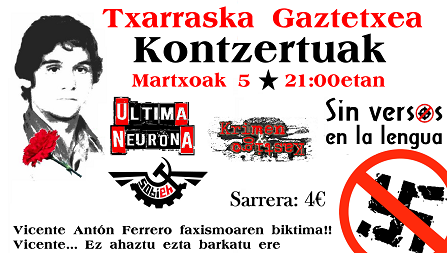 La tarde del 8 de Marzo de 1976, en la localidad Bizkaitarra de Basauri, las armas de la Guardia Civil dispararon contra un grupo de manifestantes que protestaban por la muerte en Gasteiz, cinco días antes, de cinco trabajadores, victimas tambien ellos del fuego real de las F.S.E, esta vez de la Policia Armada. Los disparos hechos en Basauri en ese dia segaron la vida del joven de 18 años vecino de esta población. Vicente Antón Ferrero pasó a ser entoces, una de las primeras victimas del fascismo, en la mal llamada transicion española