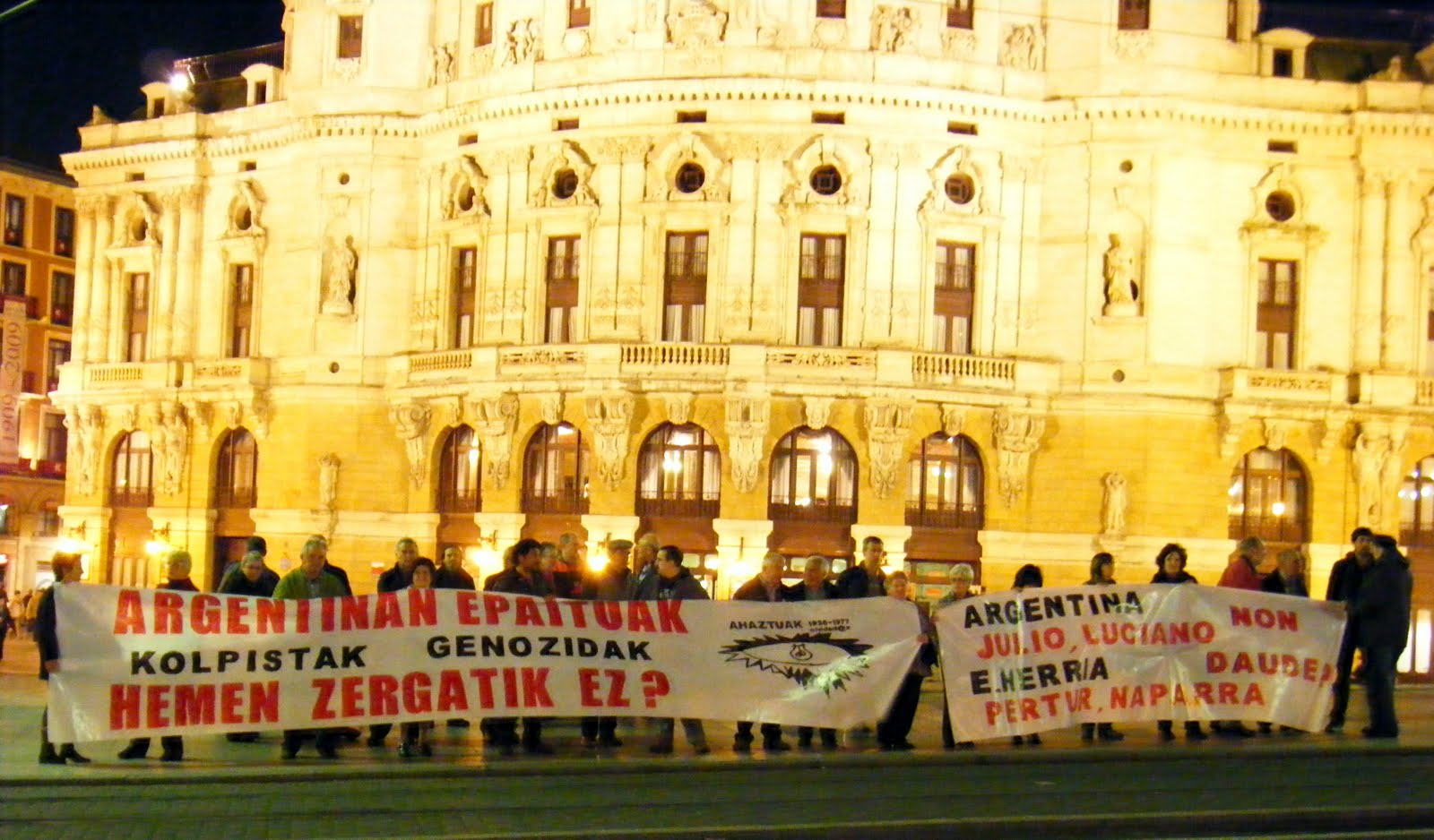 Con ocasión de cumplirse el pasado jueves los 35 años del golpe cívico-militar que el 24 de Marzo de 1976 se dió en la Argentina y que tuvo como consecuencia más brutal los más de 30.000 desaparecidos y miles de represalidos politicos, la asociación de victimas del régimen franquista Ahaztuak 1936 – 1977 realizó ayer una concentración en Bilbo. Varias decenas de personas se concentraron tras una pancarta en la que podia leerse «Kolpistak, genozidak. Argentinan epaituak. Hemen zergatik ez?» (Golpistas, genocidas. Juzgados en Argentina. Aqui porqué no?). Junto con ella otra pancarta hacia alusión a la desaparición aún sin esclarecer de los ciudadanos vascos Eduardo Moreno Bergaretxe, «Pertur», y Jose Miguel Etxebarria, «Naparra», asi como de los ciudadanos argentinos Julio Lopez y Luciano Arruga, presumiblemente victimas todos ellos ‑los dos primeros en Euskal Herria y los otros dos en Argentina- de la acción de bandas para![]()