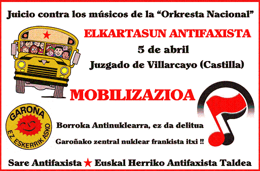 El próximo martes 5 de abril se reanuda en Villarcayo (Burgos) el juicio contra músicos de la «Orkresta Nacional» y un portavoz de la Coordinadora contra Garoña, que fueron denunciados por la Guardia Civil por cantar en la última Marcha contra la nuclear de Garoña.