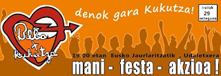 Jueves 29 de septiembre – 19:00h, bajo el lema «Denok gara Kukutza» manifestación con ikurras, pancartas, ruidosa y de color kukutza (naranja), desde la sede del gobierno titere de Gasteiz en Bilbo (Gran Via) al ayuntamiento de Bilbo.