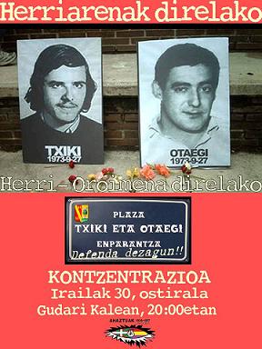 Desde Ahaztuak señalaron tambien que esta concentración “es el inicio de una dinámica que pondremos en marcha en Zornotza en las próximas semanas y que tendrá como objetivo trasladar nuestra reflexión, nuestra denuncia y nuestra reivindicación a la ciudadanía y a los agentes sociales, politicos e institucionales de esta localidad para conseguir que la resolución judicial sea revocada y la calle en homenaje a Txiki y Otaegi sea nuevamente recuperada con todo su valor de memoria y homenaje y la placa que le daba nombre repuesta en su sitio”. De igual modo y tambien en las próximas semanas desde Ahaztuak 1936 – 1977 se pondrán en marcha dinámicas similares en otras localidades ‑Etxebarri, Getxo, Leioa…- donde “estos luchadores antifascistas, estas victimas del franquismo y otras tenian calles y/o plazas en su memoria puestas por la voluntad y el sentimiento popular, por más que el modelo de impunidad español que antes las toleraba a regañadientes ahora dicte resoluciones para eliminarlas mientras sigue manteniendo en su sitio tantos elementos de la simbologia franquista”.
