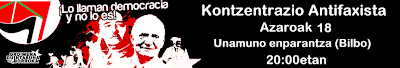 Azaroak 18 Noviembre Kontzentrazio Antifaxista «Lo llaman democracia y no lo es» Ordua/Hora: 20:00 etik – 20:30 etara. Tokia: Unamuno enparantza Alde Zaharra * Bilbo