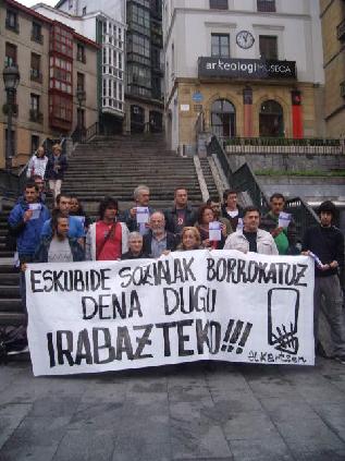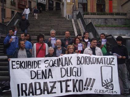 La hue­lla eco­ló­gi­ca (que nos con­de­na a la auto-explo­ta­ción y auto-pre­ca­ri­za­ción) con­ti­núa aumen­tan­do ya que uti­li­za­mos casi otras tres Eus­kal Herria, ade­más de la que ya exis­te, para poder abas­te­cer­nos pro­du­cir y repro­du­cir­nos. El uso y dis­fru­te de una vivien­da se ha con­ver­ti­do en un ele­men­to de chan­ta­je (son ya 7 los desahu­cios dia­rios que se dan en Ara­ba, Biz­kaia y Gipuz­koa), en el que o pagas a los agen­tes espe­cu­la­ti­vos o bajas a lo más pare­ci­do al infierno de Vir­gi­lio, “de pati­tas a calle”. Aun­que la cla­se polí­ti­ca pro­fe­sio­nal no se que­da aquí, ya que con el pro­yec­to de modi­fi­ca­ción de la ley 182008 (que supo­ne impor­tan­tes recor­tes que se suman a los ante­rio­res) pre­ten­der dar una nue­va vuel­ta de tuer­ca a la vul­ne­ra­ción de dere­chos socia­les, dejan­do des­pro­te­gi­do de una for­ma cla­ra y pre­me­di­ta­da a quie­nes más nece­si­da­des tienen.