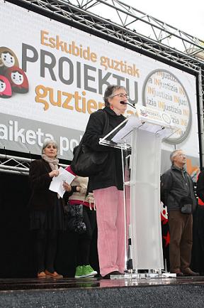 Arantza Urkaregi en euskara, explicó que las dos primeras sesiones de la vista oral en la Audiencia Nacional les han servido para constatar que el único delito que les tratan de imputar la Fiscalía y la Policía española es haber ofrecido ruedas de prensa, ser interventores o formar parte de las candidaturas de D3M y Askatasuna. «Esa ‑señaló la profesora universitaria- es la base que tienen para decir que somos miembros de ETA o colaboradores».