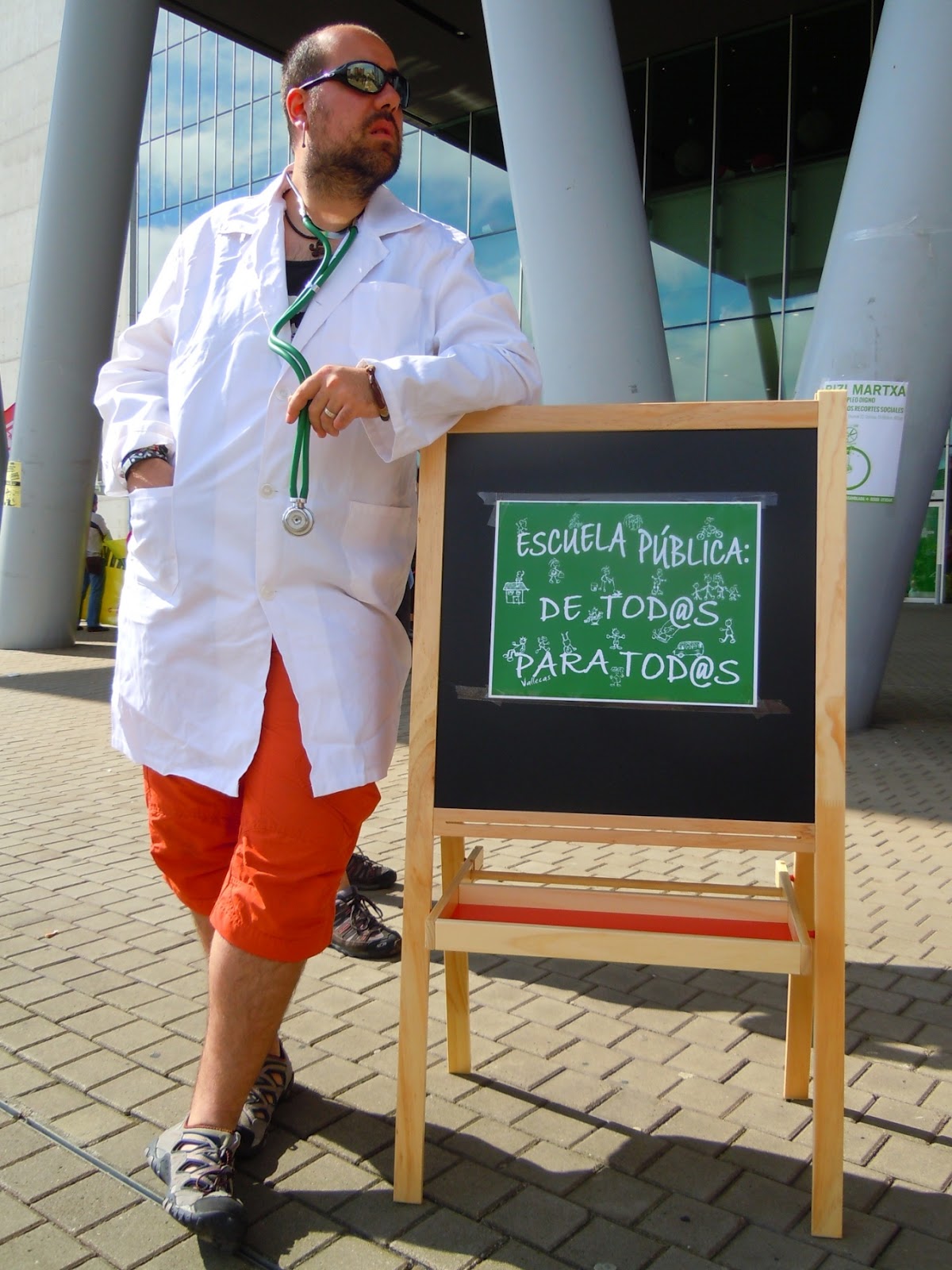 •En esta movilización han participado personas con material deportivo de ciclista (bicicletas, maillots, cascos y culots). Además, de individuos con estetoscopio y vestuario propio del personal médico; junto a pupitres, sillas y encerados típicos de una escuela.