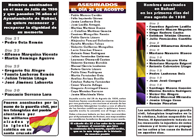 Las matanzas de Buñuel comenzaron el día 21 de julio, con un muerto, continuaron el 23 (alcalde y secretario), siguieron dos días después (otros cuatro ejecutados) y una ejecución más el día 30. Agosto fue aún más cruento: seis víctimas el día 3, otra el 5, una el 9, tres el 10, una el 12, una el 15, seis el 18, hasta que llegó la saca más importante, la del día 26 de agosto en la que 16 personas fueron ejecutados por sus propios convecinos.