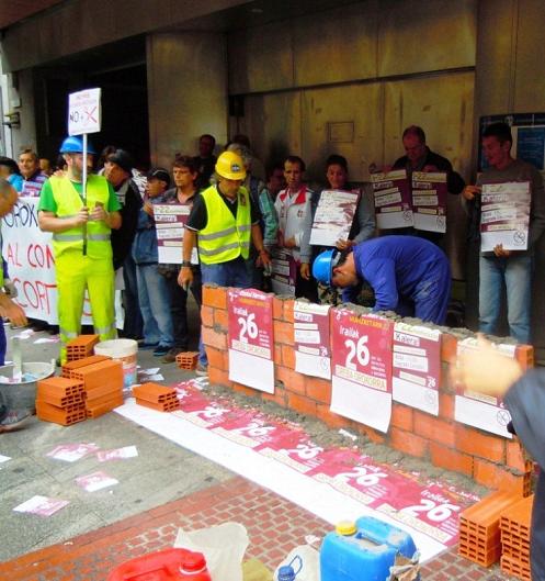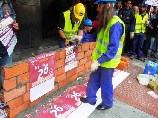 Más de 200 ladri­llos, cemen­to, are­na, y el res­to del mate­rial nece­sa­rio para su cons­truc­ción, ha sido uti­li­za­do para edi­fi­car un muro bajo el lema «La Huel­ga del 26S, un muro social con­tra los recor­tes». Huel­ga Gene­ral que ser­vi­rá de con­ten­ción a los dife­ren­tes recor­tes socia­les apli­ca­dos por Rajoy, Patxi López y Yolan­da Barcina.