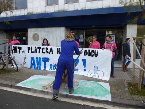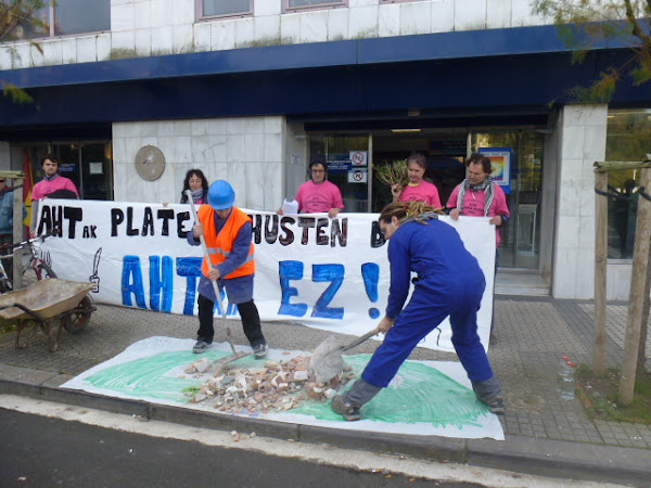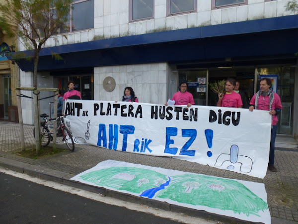 Los participantes en el ayuno acompañados por otras personas opositoras al TAV se han concentrado ante la delegación del Gobierno Vasco, portando una pancarta y realizando una acción simbólica de denuncia de las destructivas políticas del hormigón. A continuación han entregado la carta en Jaurlaritza