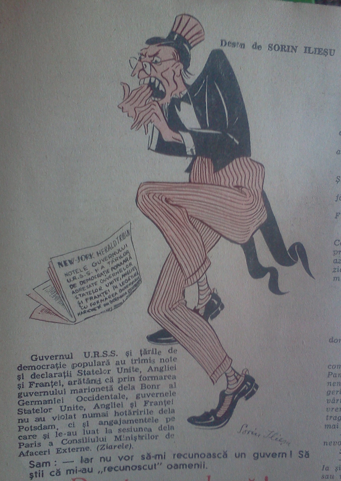 Veamos algunos ejemplos del sentido del humor y de la lucha de clases llevada a cabo por la Revista Urzica en los primeros tiempos de la República Popular Rumana. En el número que vamos a compartir aquí, del 20 de Octubre de 1949, podremos disfrutar de fabulosas caricaturas del imperialismo yankee haciéndose dueño de toda Europa Occidental, de la victoria del pueblo chino y el nacimiento de la Republica Popular China frente al Koumitang y sus financiadores capitalistas, de la perpetuación del nazismo en la incipiente Republica Federal Alemana, auspiciada por el Tio Sam, o de algunas caracteristicas que, tras la instauración del neoliberalismo por los mismos que organizaron el golpe de estado de diciembre de 1989 y que acabo con el Socialismo, son hoy de nuevo comunes: la mercantilización de la sanidad, o los despidos de miles de trabajadores a capricho de los grandes empresarios.