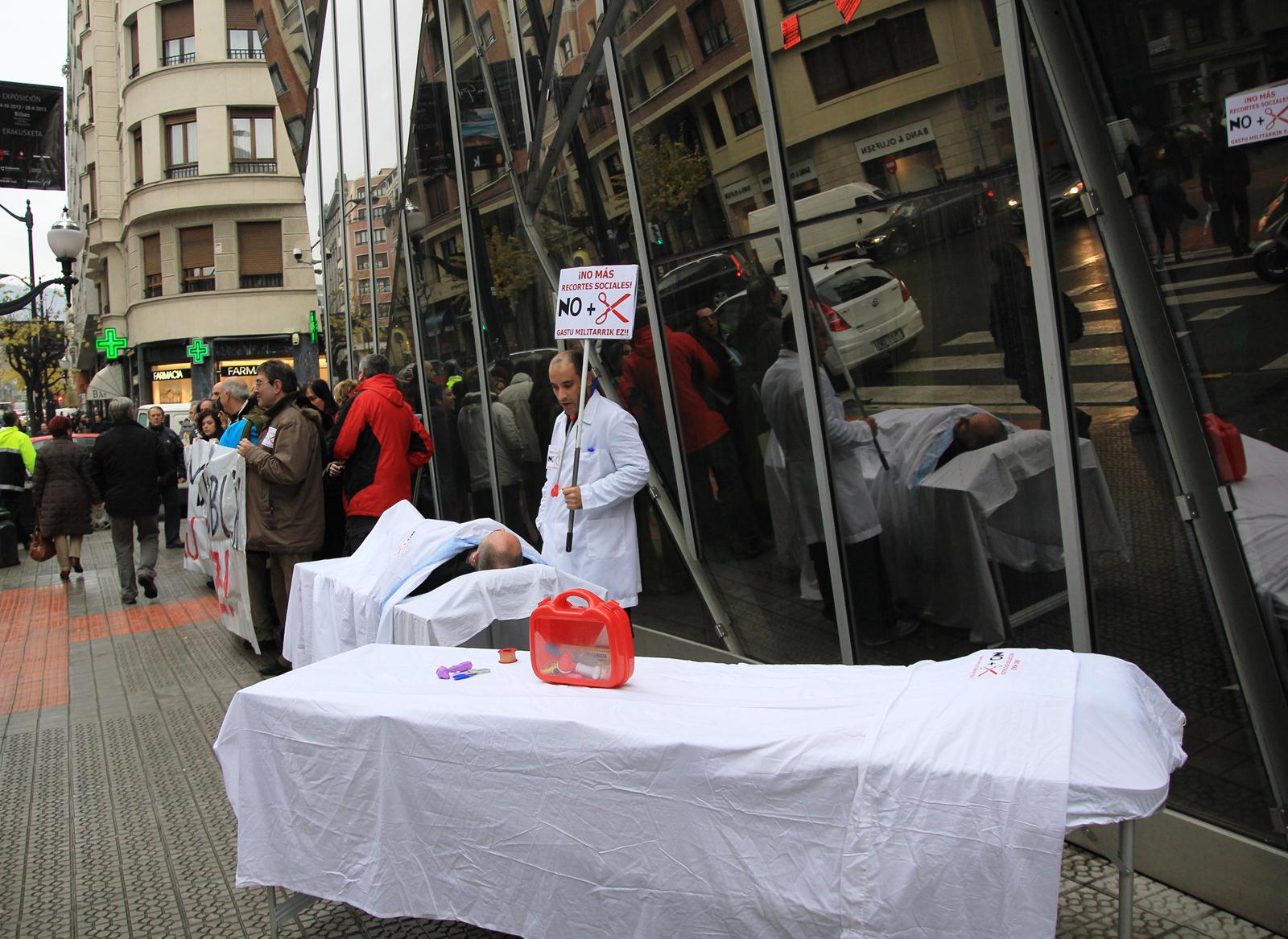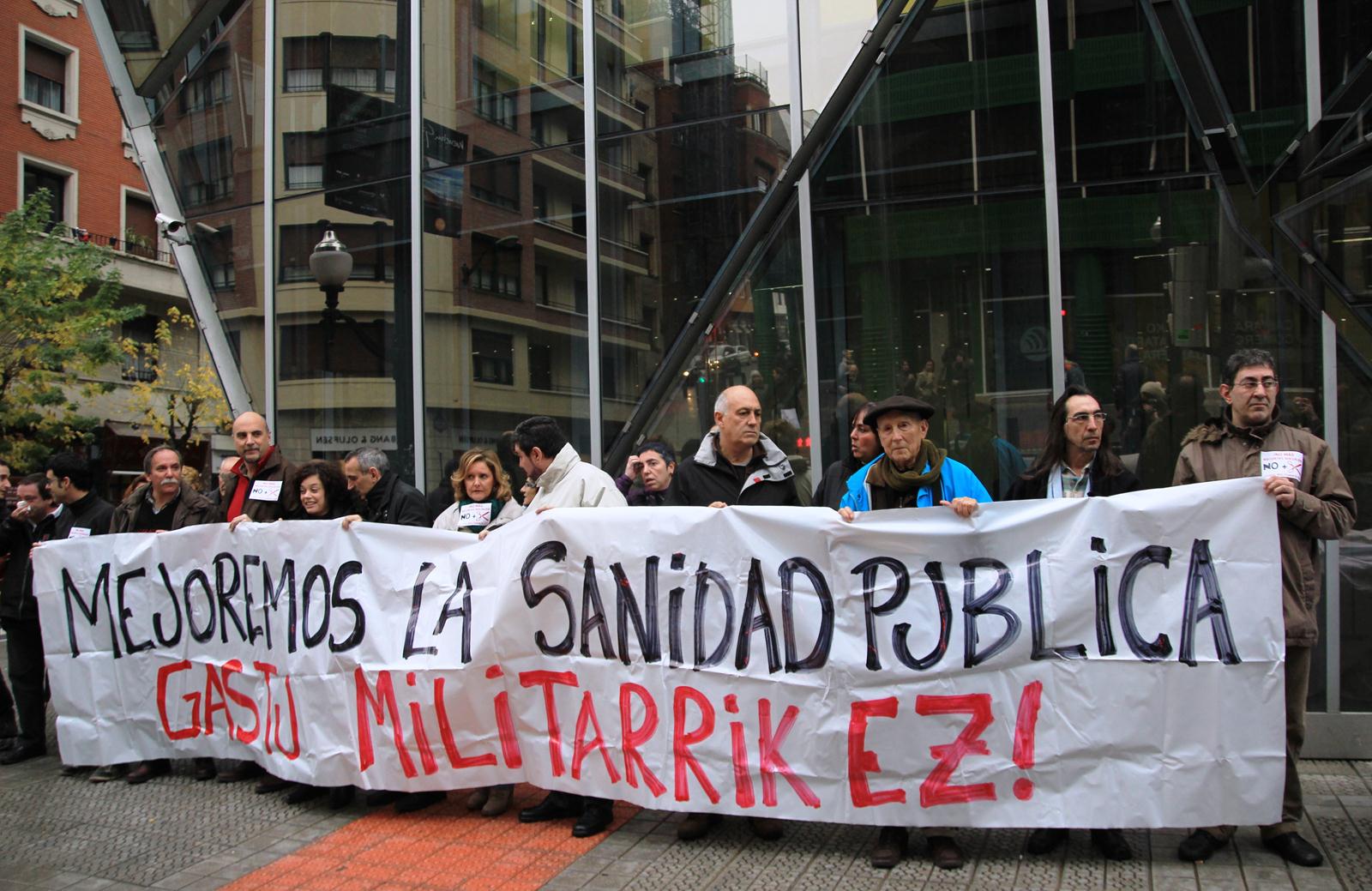 Representantes de las secciones sindicales en Osakidetza de ELA, LAB y ESK, así como del grupo antimilitarista Kakitzat —entre ellos varios activistas barakaldeses— se han concentrado este martes ante la delegación de Sanidad del Gobierno Vasco en Bizkaia para denunciar que mientras crece el «gasto militar» se está produciendo un recorte de los recursos económicos destinados a salud y acción social.