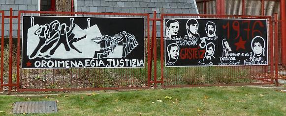 Justo en el lugar había un mural que recordaba a esas personas, que por el mero hecho de defender los derechos que les correspondía como trabajadores, fueron tiroteados por la policía española con el balance de tod@s conocidos. Se coloco por primera vez en setiembre de 2011, pero fue retirado por las protestas y amenazas del “señor párroco” al cual, parece no le agradaba el mural.