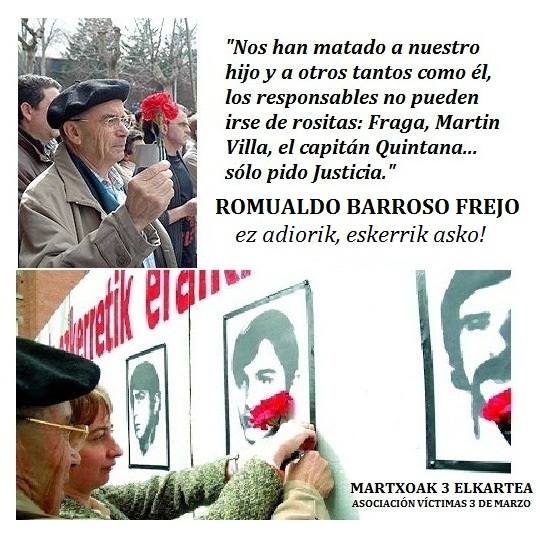 Con pro­fun­do dolor y mayor res­pe­to des­de Ahaz­tuak 1936 – 1977 hemos de des­pe­dir a Romual­do Barro­so Fre­jo, padre de otro Romual­do ‑el ase­si­na­do por los dis­pa­ros poli­cia­les el 3 de Mar­zo de 1976 en Vito­ria- y lucha­dor incan­sa­ble por la memo­ria de su hijo y de los demás tra­ba­ja­do­res ase­si­na­dos aquel día.