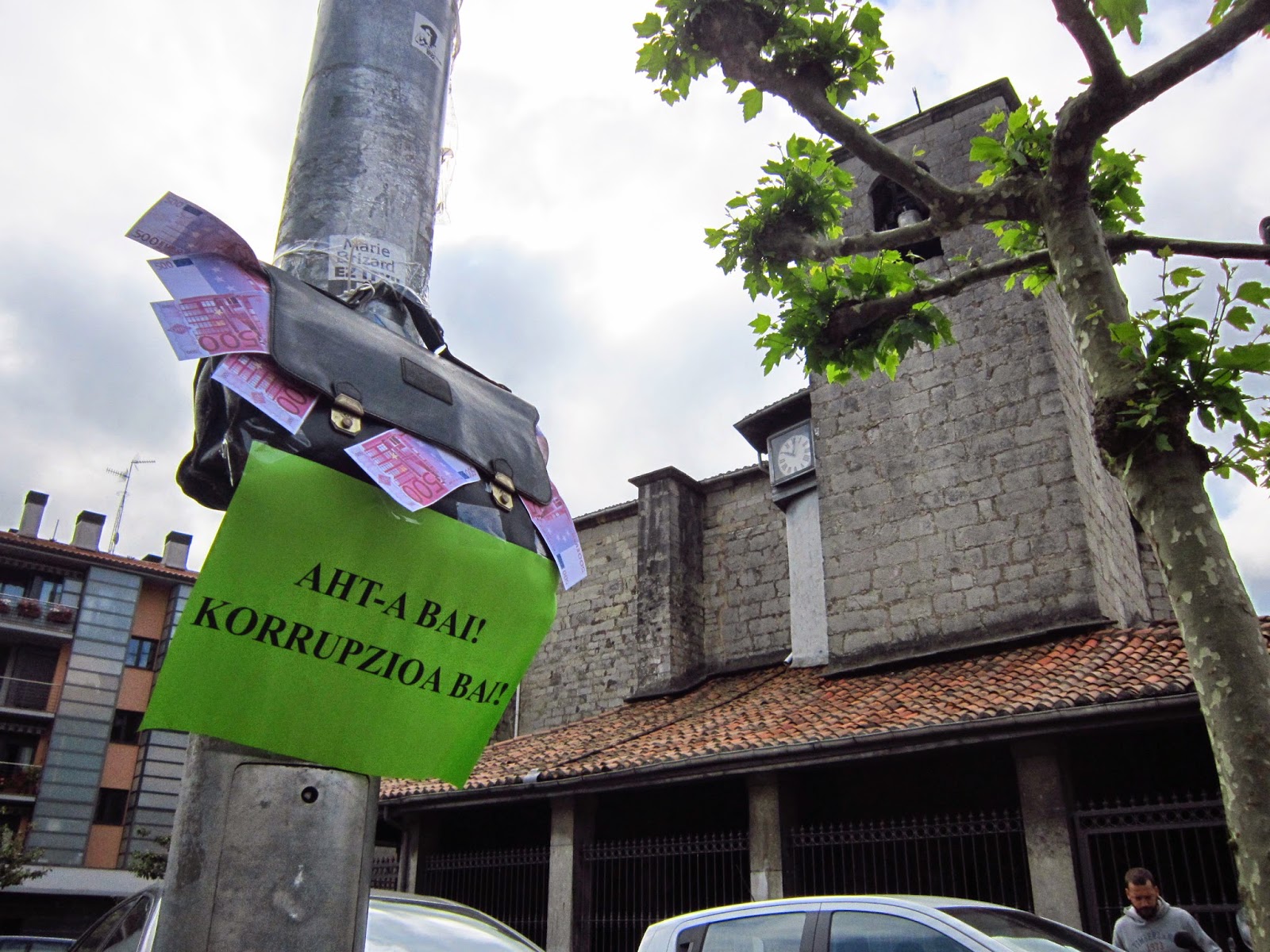 Hoy es San Maletín, la recreación visual de la corrupción existente en el TAV. A iniciativa de Mugitu en calles, sedes de partidos políticos y otros lugares han aparecido decenas de maletines rebosando dinero. Una imagen muy clara del gran negocio que es el TAV. Desde Mugitu Mugimendua, movimiento de desobediencia civil contra el TAV, queremos denunciar alto y claro que el Tren de Alta Velocidad es un proyecto turbio desarrollado bajo la sombra de la corrupción. Además de suponer un auténtico despilfarro de miles de millones de euros de dinero público y de destrozar el territorio, el TAV se está consolidando como un proyecto ruinoso, una pesada losa que ya está hipotecando nuestros bolsillos en un contexto de fuertes recortes sociales en sanidad, educación y prestaciones sociales. Pero no solo eso, como ya hemos dicho en más de una ocasión, una obra de gran infraestructura de semejantes características supone un gran pastel político y económico, del que muchos han sacado tajada.