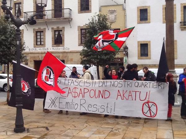 Medio centenar de Antifascistas italianos y vascos, nos hemos concentrado en Bilbao este sabado, en apoyo al Centro Social Dordoni de Cremona (Italia), atacado por nazi-fascistas hace unos dias y que mantiene, entre la vida y la muerte, al compañero Emilio.