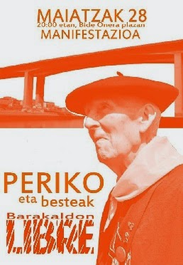 El primero de estos casos será el de Periko. Periko Solabarria será juzgado en la audiencia nacional los días 27 y 28 de mayo, acusado de enaltecimiento del terrorismo, por hablar en un mitin de la organización juvenil Ernai. Se enfrenta, junto con otros jóvenes de dicha organización, a una petición de un año y seis meses de prisión. Para dar a conocer su caso, las iniciativas que hemos organizado en su apoyo, los casos de otros barakaldesxs y las adhesiones que hemos conseguido, realizaremos una rueda de prensa la próxima semana.