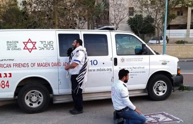 Foto: En Tel Aviv, un enfermero judío reza hacia Jerusalén, mientras su compañero musulmán reza hacia La Meca.