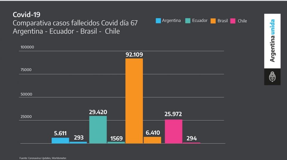 En comparación con la región, Fernández demostró que la situación argentina es mucho mejor que la de varios países vecinos, como Brasil y Chile, lo que permite «mostrar el éxito de control» sobre la pandemia. Pero pidió «no perder de vista que éste es un virus que nosotros salimos a buscar», por lo que cuánto mayor sea la protección, mejor evolucionará la situación sanitaria. «Tiene sentido el esfuerzo que estamos haciendo», remarcó al contrastar la tasa de mortalidad que registra el país frente al resto del mundo: «Logramos aplanar la curva de contagios», resumió.