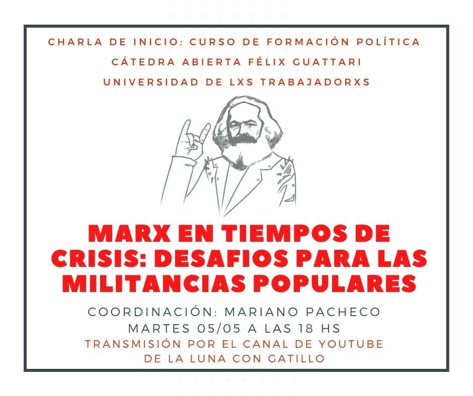 La charla, asimismo, presentará el Curso de Formación Política de La Cátedra Abierta Félix Guattari de la Universidad de lxs Trabajadorxs que, bajo el título “Marx en tiempos de crisis: desafíos para las militancias populares”, comenzará el próximo martes 12 mayo, a las 18 horas, por el mismo canal.