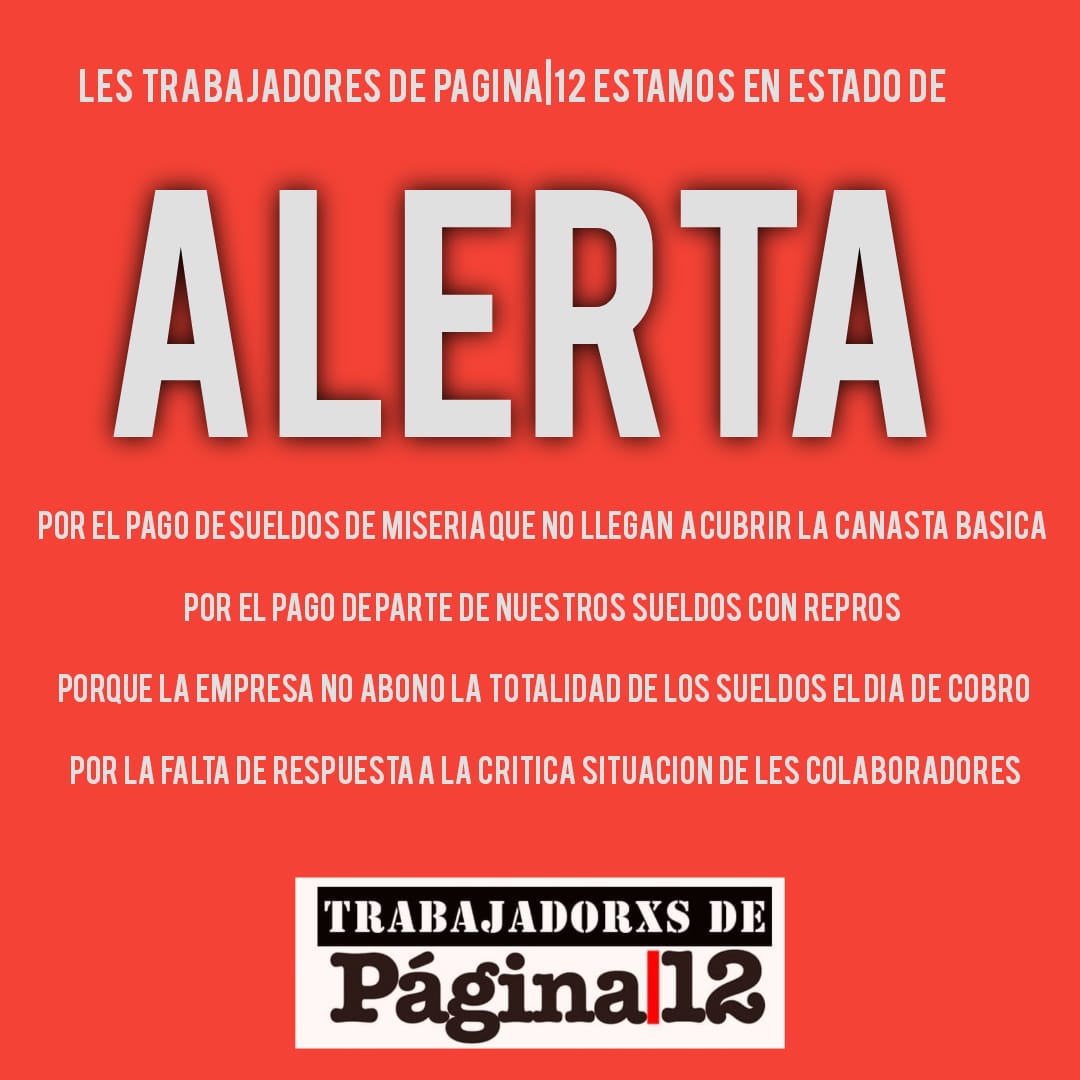 Los trabajadores y trabajadoras de Página/12, reunidos en asamblea virtual el pasado viernes 15 de mayo, nos declaramos en estado general de alerta debido a distintas situaciones salariales y laborales que venimos atravesando en el último tiempo y que se suman al profundo atraso salarial que ya de por sí sufrimos. Por empezar, ni bien se decretó la cuarentena obligatoria exigimos mejores condiciones salariales para les colaboradores, compañeros ultra precarizados y expuestos a salarios de hambre y a la incertidumbre del trabajo a destajo. Ese reclamo, que fue elaborado por la Comisión Interna y respaldado en asamblea, no tuvo respuesta alguna, acentuando el ninguneo de la empresa hacia este sector. Por otro lado, por segunda vez consecutiva, este mes el Grupo Octubre no abonó en tiempo la totalidad de los salarios, haciendo que una parte de les trabajadores completara su salario después del día de cobro, algo que no suele ocurrir en el diario. Como si fuera poco, esta semana nos comunicaron que a partir de mayo, y por tres meses, cobraremos parte de nuestro salario a través del programa Repro, lo cual nos implica realizar un trámite bancario presencial que obliga a movilizarnos en el marco de esta pandemia. Esta situación nos preocupa extremamente, ya que entre nuestros compañeros y compañeras hay personas incluidas en los grupos de riesgo. Atentos a esta serie de acontecimientos y medidas, nos declaramos entonces en estado de alerta, instando a la empresa a que revise las mismas y nos garantice soluciones urgentes de acuerdo a parámetros sanitarios y salariales dignos.