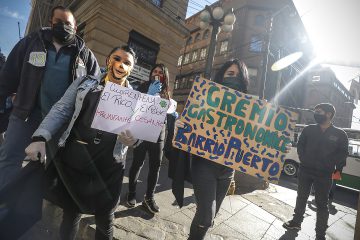 Dece­nas de tra­ba­ja­do­res gastronómic@s mar­chan esta maña­na por el cen­tro de Val­pa­ra­iso. Demues­tras su males­tar y sus deman­das ante la gra­ve cri­sis que padecen.