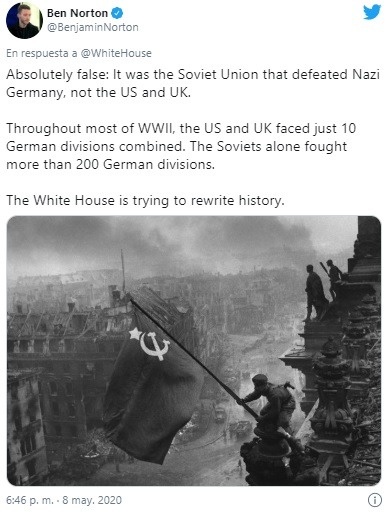 «Absolutamente falso. Fue la Unión Soviética la que derrotó a la Alemania nazi, no fueron EE.UU. y el Reino Unido. Durante la mayor parte de la Segunda Guerra Mundial, EE.UU. y el Reino Unido enfrentaron solo 10 divisiones alemanas combinadas. Solo los soviéticos lucharon contra más de 200 divisiones alemanas», escribió el periodista Ben Norton, subrayando que la Casa Blanca «está tratando de reescribir la historia».