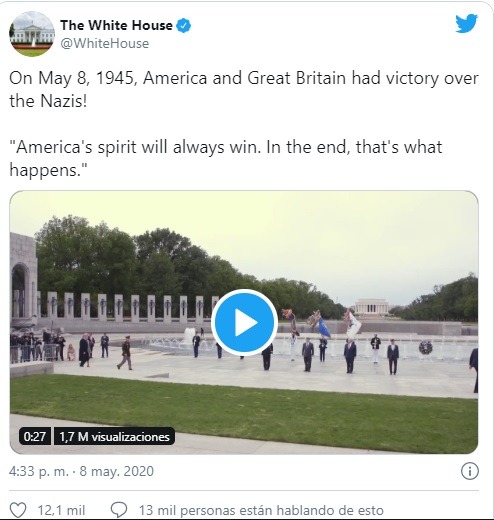 «¡El 8 de mayo de 1945, EE.UU. y el Reino Unido consiguieron la victoria sobre los nazis! El espíritu de EE.UU. siempre ganará. Al final, eso es lo que sucede», reza un tuit de la Casa Blanca, acompañado con unas imágenes de una ceremonia de colocación de ofrendas florales para conmemorar la ocasión.