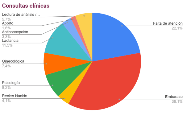 En relación con las consultas clínicas, un total de 122, la gran mayoría fueron a raíz de la falta de atención o por temor a concurrir a las guardias/consultas. Un 36.1% fueron consultas relacionadas al embarazo; casi un 38% por no saber qué hacer a raíz de la falta de atención y lectura de análisis clínicos; un 11% de lactancia y un 8.2% de consultas psicológicas (hubieron varias más que se entremezclaron con otras consultas, ya que observamos un alto grado de angustia por la situaciones de pandemia y falta de atención). Éstas y otras consultas como las ginecológicas, abortos y anticoncepción (un 12%) con sus respectivos seguimientos, fueron atendidas por profesionales de cada disciplina: psicólogas, obstétrica, médica y puericultoras.