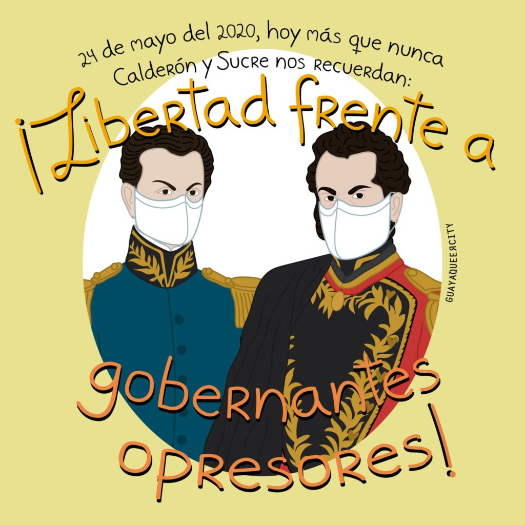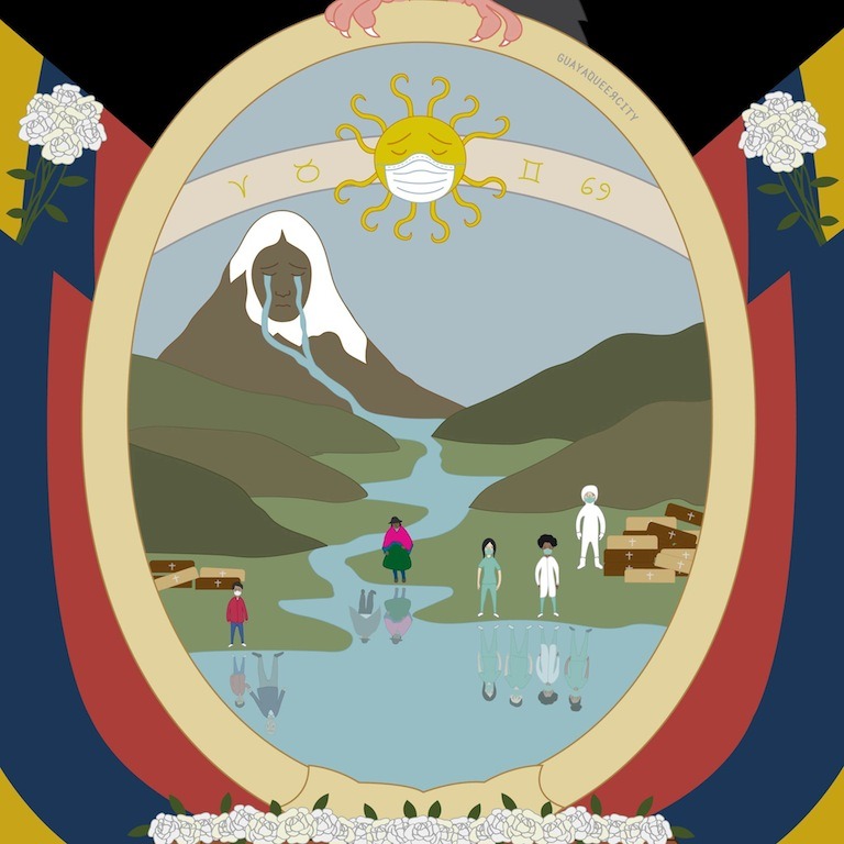 Formo parte de Guayaqueer City, donde trabajo como persona a cargo del tema social gestionando las colaboraciones con otros colectivos. Guayaqueer City es una plataforma que toma un poco del imaginario guayaco, del imaginario ecuatoriano y lo combina con el imaginario marica y LGBTIQ+. Entonces es un ejercicio de reapropiación de símbolos como el escudo y personajes de nuestra historia y haciéndolos nuestros en este ejercicio de tomar un lugar en la historia que por mucho tiempo se nos ha sido negado. Ese es un poco el ejercicio de Guayaqueer City, por medio de ilustraciones que hace Víctor García, él es el creador e ilustrador de Guayaqueer City.