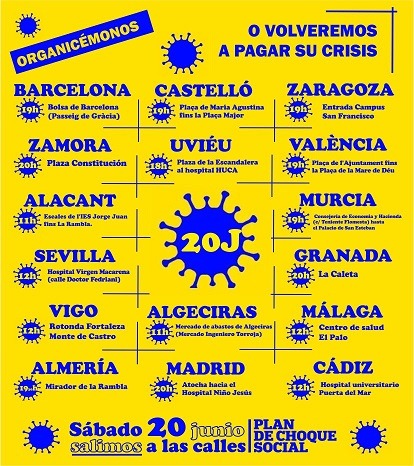 Las manifestaciones del 20J, que en algunas ciudades coincidirán con los reclamos del personal sanitario y con las protestas que exigen la regularización de las personas sin papeles, llega después de varias semanas de movilizaciones por la sanidad pública frente a los hospitales, contra el racismo, por el medioambiente o por la Renta Básica. “En un momento en que las calles vuelven a llenarse, había que recuperar también la protesta en el espacio público dada la gravedad de la crisis. Si se puede salir para trabajar, consumir y reactivar la economía también tiene que ser posible la reivindicación con las precauciones necesarias. Las de abajo tenemos que dar una respuesta a la altura de los problemas que sufrimos”.