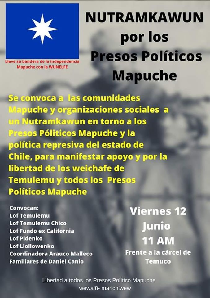 Hoy, viernes 12 de junio a partir de las 11 AM en el frontis de la cárcel de Temuco pu Lof y Organizaciones Sociales convocan a un NUTRAMKAWUN (conversatorio) en apoyo a los Presos Políticos Mapuche y llaman a «repudiar la política represiva y el reciente montaje del estado chileno hacia nuestro weichafe del Lof Temulemu.»