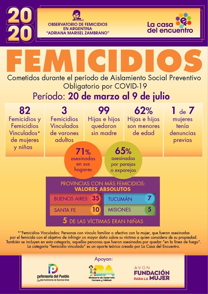 Los últimos 14 días se produjeron 7 Femicidios según este nuevo informe del Observatorio de Femicidios “Adriana Marisel Zambrano”, el octavo desde que se implementó el aislamiento social preventivo y obligatorio. En CABA y el AMBA se volvió a la fase 1 de la cuarentena para protegernos del contagio del COVID y con esta medida aumentó el peligro para quienes se encuentran en situación de violencia.
