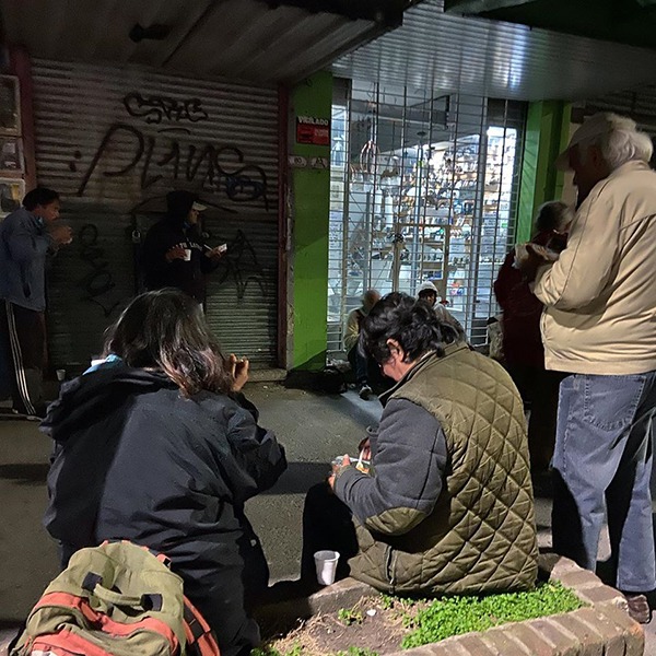 Bondi Sur mira el rostro del pibe de 30 y lo rescata con una sistematicidad de años del sitial del olvido cada jueves y cada domingo. Jona, Barby, Julieta y Marina hablan de viejos anclados en las calles desde que la circularidad de los márgenes los va llevando a dejar de pagar la luz, a no tener gas, a quedar a oscuras y con techo para dormir pero platos vacíos para comer.