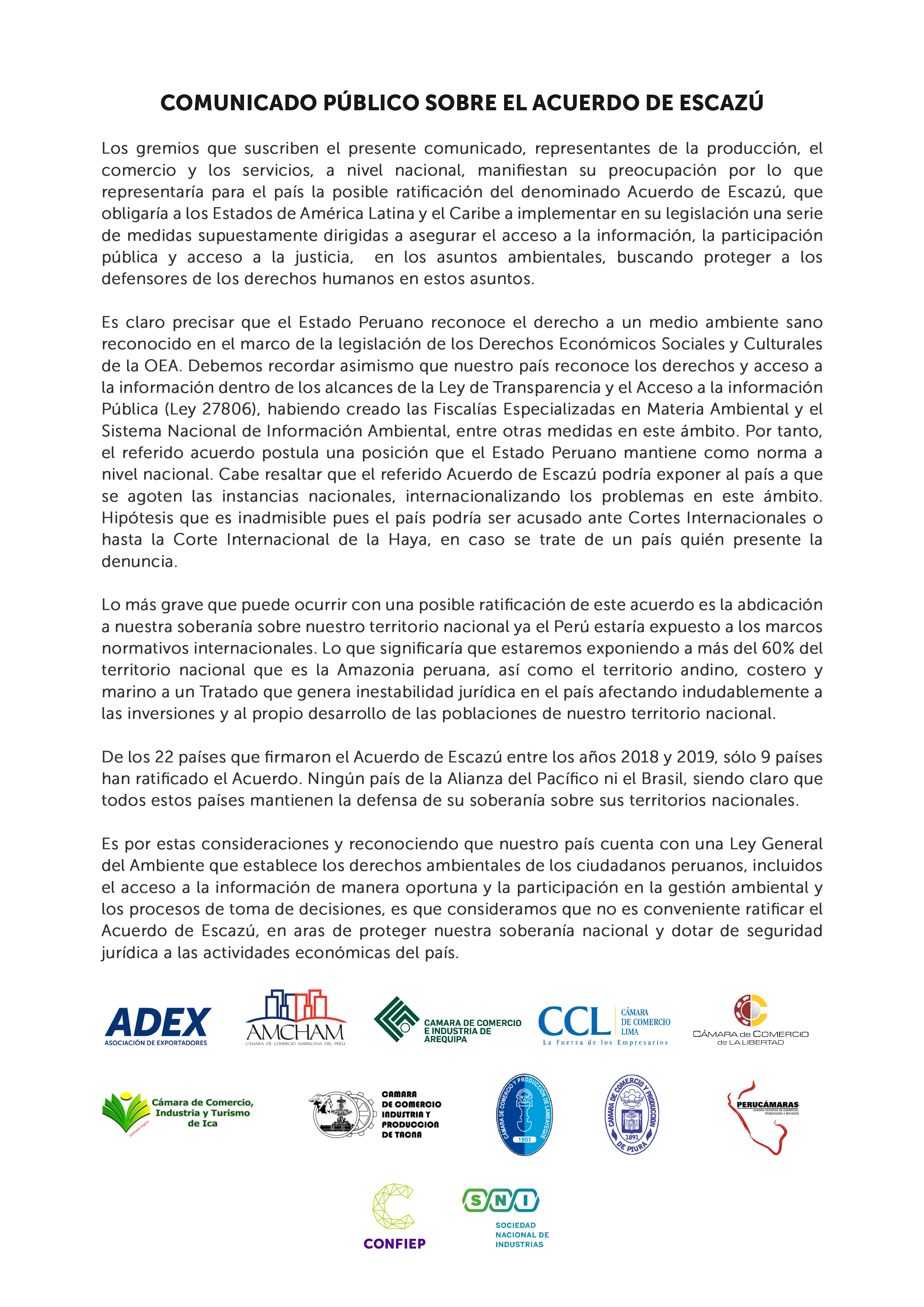 MENTIRAS. Comunicado emitido por la Confiep y gremios del sector empresarial, donde aseguran que la ratificación del acuerdo traería consigo la «abdicación a nuestra soberanía» como país.