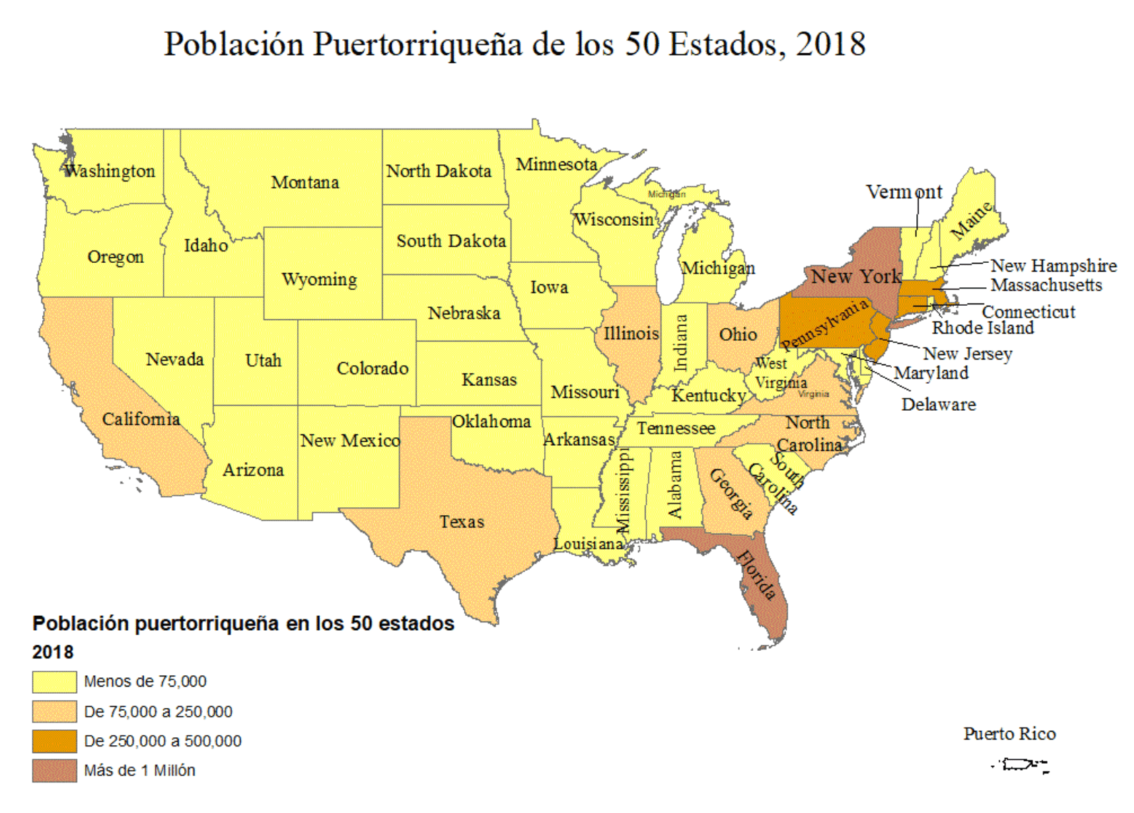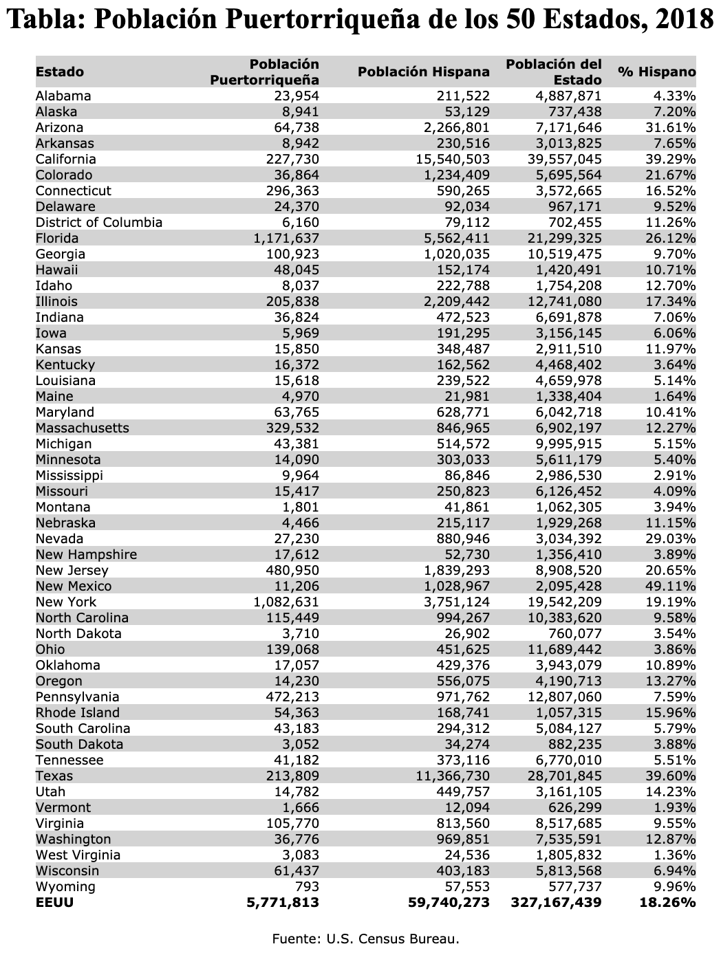 Hay otros esta­dos que expe­ri­men­ta­ron gran aumen­to de la pobla­ción puer­to­rri­que­ña entre el 2000 y el 2018. En Pennsyl­va­nia el aumen­to fue de 269,282, para alcan­zar una pobla­ción puer­to­rri­que­ña de 472,213. En Texas el incre­men­to fue de 129,368, tota­li­zan­do 213,809 resi­den­tes bori­cuas, mien­tras que en Mas­sa­chu­setts el aumen­to fue de 124,182 para alcan­zar la cifra de 329,532. La pobla­ción puer­to­rri­que­ña de los cin­cuen­ta esta­dos, que pron­to alcan­za­rá la cifra de 6 millo­nes de per­so­nas, se encuen­tra dis­tri­bui­da como indi­ca la tabla al final de esta nota.