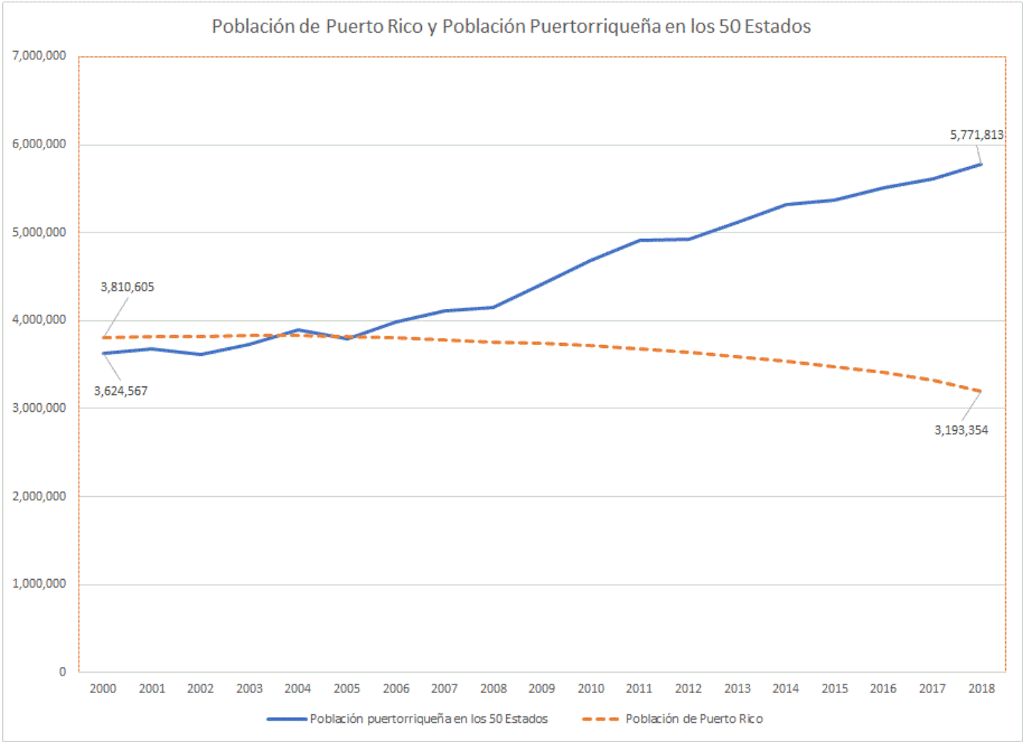El aumen­to de la pobla­ción puer­to­rri­que­ña con­ti­nen­tal se pro­du­ce simul­tá­nea­men­te con la dimi­nu­ción abso­lu­ta de la pobla­ción de la Isla. Puer­to Rico tenía más gen­te en el año 2000 que hoy. El gran éxo­do de las últi­mas dos déca­das difie­re de la gran emi­gra­ción puer­to­rri­que­ña de los años 1950 en que aque­lla ola migra­to­ria no resul­tó en la dimi­nu­ción abso­lu­ta de la pobla­ción de la isla, la cual siguió cre­cien­do a pesar del gran núme­ro de puer­to­rri­que­ños que par­tía para los Esta­dos Uni­dos. Pero en la ola actual, el éxo­do y las tasas de nata­li­dad muy redu­ci­das han resul­ta­do en la mer­ma de la pobla­ción de la Isla de 3,810,605 habi­tan­tes en 2000 a 3,193,354 en 2018, una dimi­nu­ción de 16%. Podría­mos decir que uno de cada seis habi­tan­tes se ha ido.
