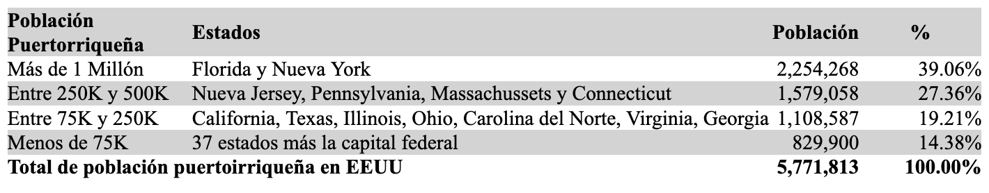 En 2018, 64% de los puer­to­rri­que­ños vivían en los 50 esta­dos y la capi­tal fede­ral, el otro 36% en la Isla de Puer­to Rico. Al comen­zar el siglo la pobla­ción de la Isla aven­ta­ja­ba, aun­que por poco, a la pobla­ción puer­to­rri­que­ña de los 50 esta­dos. La ven­ta­ja se tor­nó a favor de los 50 esta­dos en 2006, año en que se ter­mi­nan las exen­cio­nes con­tri­bu­ti­vas 936 en Puer­to Rico y se ace­le­ra el éxo­do ini­cia­do por la pér­di­da de empleos indus­tria­les en la Isla. La eco­no­mía de Puer­to Rico, que a tra­vés del siglo vein­te nun­ca pudo pro­veer sufi­cien­tes empleos a la pobla­ción, empe­zó a colap­sar con la eli­mi­na­ción de las 936. Cuan­do se publi­quen los datos del cen­so de los Esta­dos Uni­dos del 2020, por lo menos dos ter­ce­ras par­tes de los puer­to­rri­que­ños van a estar en los 50 esta­dos, y un ter­cio en la Isla. Los puer­to­rri­que­ños son, hoy por hoy, un pue­blo diaspórico.