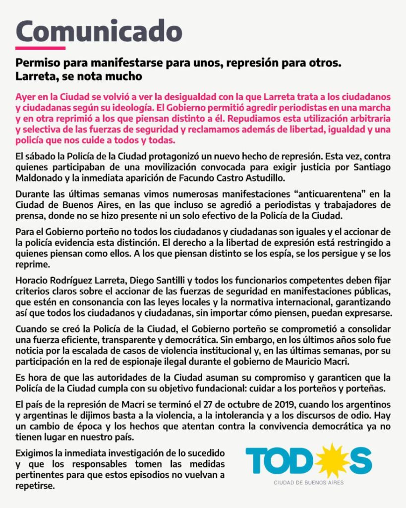 El blo­que de legis­la­do­res por­te­ños del Fren­te de Todos expre­só este domin­go su repu­dio a la repre­sión de la Poli­cía de la Ciu­dad a quie­nes el sába­do mar­cha­ron en home­na­je a San­tia­go Mal­do­na­do. En ese mar­co, advir­tie­ron que el jefe de gobierno Hora­cio Rodrí­guez Larreta»olvida que el Esta­do de dere­cho se basa en igual­dad ante la ley».