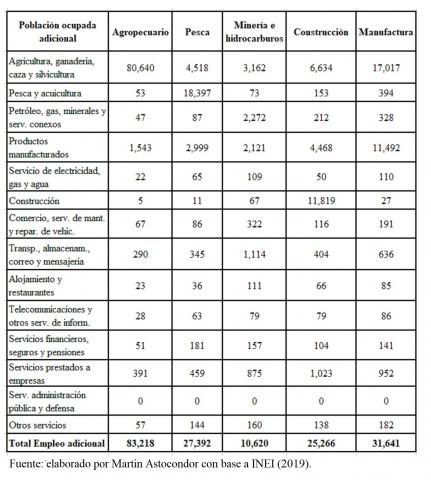 Se presenta la generación de empleo de aumentar la demanda final en cinco actividades económicas. Los resultados son interesantes con mayores impactos en el sector agropecuario; seguido por la manufactura por sus mayores encadenamientos productivos; pesca; construcción y por último los hidrocarburos y productos mineros. El impacto total sobre el empleo de una mayor demanda de productos agropecuarios sería 8 veces más del que ocurriría en los hidrocarburos y minería por el mismo aumento de la demanda.