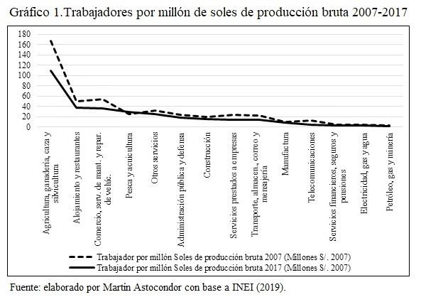 En el gráfico 1 se muestra la generación de empleo relativa a la producción bruta de las principales actividades económicas para 2007 y 2017 del Perú donde se observa una ligera reducción entre ambos periodos. Un millón soles de producción bruta generó 109 empleos en el sector agropecuario mientras que solo 2 en los hidrocarburos y el petróleo en 2017. Asimismo, la actividad con mayor generación de empleo relativo es la agropecuaria, seguida por alojamiento y restaurantes, comercio, pesca, otros servicios y la administración pública y defensa. Por el contrario, la que tiene menor generación de empleo son los hidrocarburos y la minería; electricidad, gas y agua; servicios financieros y telecomunicaciones. A un nivel intermedio se ubican la construcción, servicios privados, transporte y manufactura.