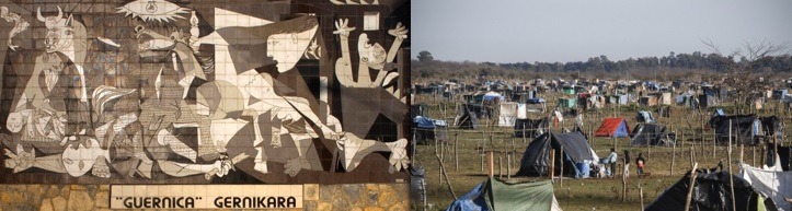 guerra civil española. La pintura atrajo la atención del público hacia la causa republicana, tanto como el peligro de represión violenta por parte de ahora meritorios policías bonaerenses convoca a la opinión pública de la Argentina. La toma de un predio desierto de cien hectáreas en Guernica tiene como protagonistas a personas sin techo que carecen de trabajo y vivienda. Son el emergente del déficit habitacional que afecta a más de un millón de familias bonaerenses. Unos dueños flojos de papeles reclaman en sede judicial el desalojo, que tiene una prórroga precaria en la búsqueda de una solución democrática lejos de los palos que derechistas trastornados imaginan para miles de desesperados excluidos del sistema que pasan frío, hambre enfermedades y no tienen trabajo ni posibilidades de obtenerlo.