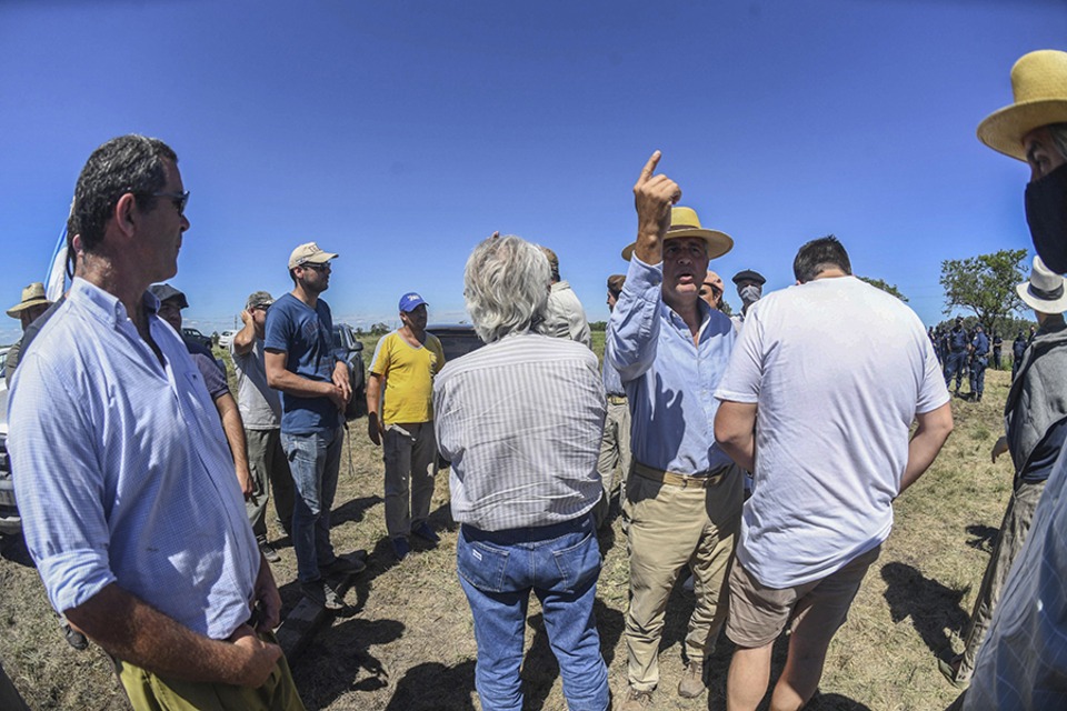 Desde el ingreso al campo, custodiados por varias decenas de policías de la división abigeato, los ruralistas siguieron la actividad desde el acampe que tiene epicentro en un gran camión que bloquea el paso.