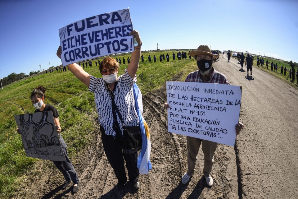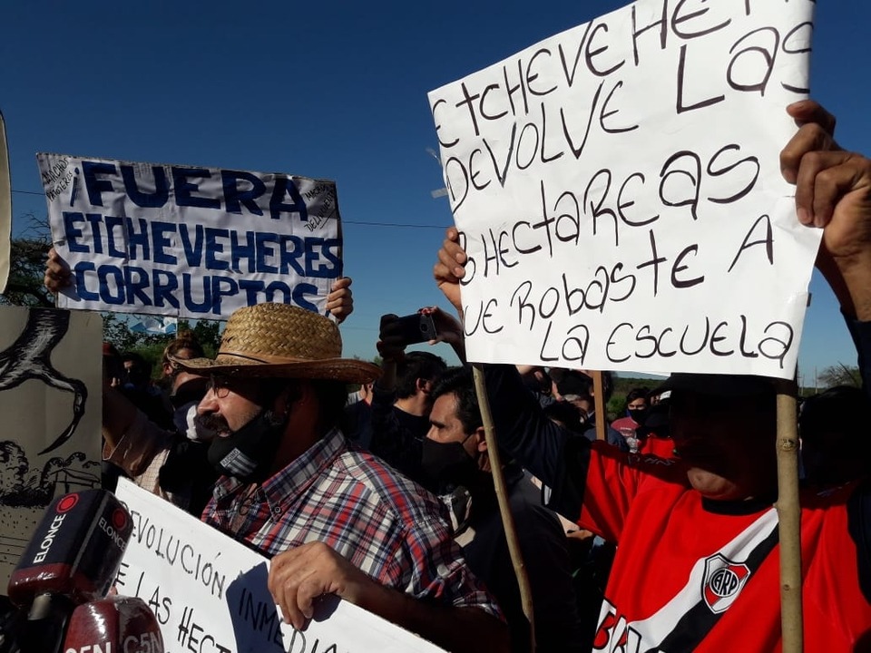 Fabián Casals, profesor de dibujo técnico en la escuela rural, sostenía un cartel que exigía “Devolución inmediata de las hectáreas de la Escuela Agrotécnica E.E.A.T. N°151. Por una educación pública de calidad. Ya las escrituras”. El docente autoconvocado afirmó que los Etchevehere le hurtaron 70 hectáreas y el aljibe a la institución: “Lamentablemente se cortó la torta por la parte más grande y se la repartieron. Los chicos, la educación pública, perdieron una cantidad de hectáreas productivas. También levantamos la voz para que paren las fumigaciones que llegaban a cinco o seis metros, pero no hubo forma, porque el poder que tienen nos pasa por encima a todos, sobre todo a los que vienen a estudiar a esta escuela”, aseguró.