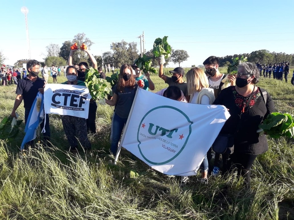 Para el final, quienes habían viajado tantos kilómetros para formar parte de esta manifestación a cielo abierto caminaron algunos pasos más hacia el cordón policial, cantando el himno nacional. Cerca de las siete, cuando la mayoría de los vehículos había desconcentrado, una camioneta de la Unión de Trabajadores de la Tierra logró llevar, previa consulta de la policía a los fiscales, mercadería agroecológica hasta la puerta del campo. A través de un pasamano por sobre la cadena gris de los Etchevehere entró la acelga, el tomate y la rúcula que crecieron en tierras sin venenos de Villaguay, Diamante, Strobel, Spasenkuter y Crespo, y que llegaron hasta Santa Elena para abastecer a quienes sostienen el Proyecto Artigas desde adentro de Casa Nueva.