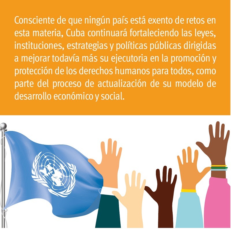 La promoción y protección de los derechos humanos para todos ha sido una prioridad en Cuba. En plena consonancia con la Declaración y Programa de Acción de Viena, la promoción y protección de los derechos humanos en la Mayor de la Antillas se basa en el carácter universal, indivisible, interdependiente e interrelacionado de estos derechos. Cuba ha abordado esta cuestión de manera justa y equitativa, en pie de igualdad y otorgando a todos los derechos el mismo peso.